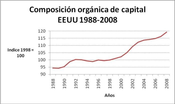 Algo de esto parece haber ocurrido en EEUU en los años noventa. Desde comienzos de la década de los 90 la COC, y hasta 1998, se mantiene relativamente estable. Desde 1995, por otra parte, se produce un salto en los avances de la productividad. Entre 1973 y 1995 la productividad (medida como output por hora de trabajo) promedio, en el sector no agrícola privado, creció a tasas de entre el 1% y 1,5% anual (Bureau of Labor Statistics). A partir de 1995 y hasta 2000 se incrementó a tasas de entre el 2% y 2,5% anual; la relación capital constante fijo por trabajador comienza a elevarse fuertemente a partir de 1998, a la par que sigue creciendo fuertemente (tasas superiores al 10% anual, véase gráfico) la inversión en equipos y software. Entre 2000 y 2006 el crecimiento de la productividad se aceleró, hasta alcanzar un incremento del 3% anual, aproximadamente. Sin embargo la inversión en equipos y software se mantuvo mucho más débil. El aumento de la productividad se explica por el hecho de que muchas inversiones en las nuevas tecnologías informáticas y de la comunicación, realizadas en los 90, estaban madurando, y daban sus frutos.