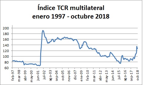 Estas violentas oscilaciones del tipo de cambio nominal y las tasas de inflación provocaron pronunciadas variaciones del tipo de cambio real. El siguiente gráfico muestra cómo varió el tipo de cambio real multilateral desde 1997 al presente.