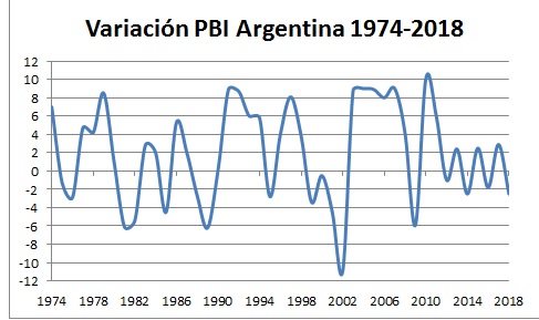 La actual crisis se inscribe en una larga historia de recurrentes caídas del producto, como puede verse en el siguiente cuadro, que registra las variaciones anuales del producto desde la crisis de 1975 hasta 2018 (primer semestre). Tomamos como referencia la crisis de 1975 ya que fue la última que ocurrió bajo la ISI, industrialización por sustitución de importaciones (o sea, el programa de avanzar en la industrialización basándose en el mercado interno).