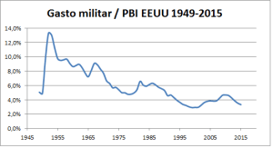 Gasto militar de EEUU en % de PBI, 1949-2015