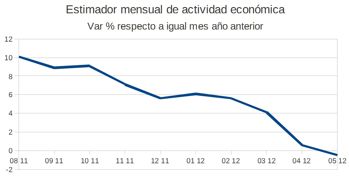 Los últimos datos del Indec indican que estamos en presencia de una pronunciada desaceleración de la actividad económica. En el siguiente gráfico se puede ver la variación porcentual del estimador mensual de actividad con respecto a igual mes del año anterior, entre mayo de 2011 y abril de 2012.