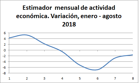 Disparada por la crisis cambiaria, la economía argentina se ha precipitado en la recesión. En septiembre, la actividad industrial se desplomó un 11.5% interanual; la construcción cayó 4,2%, también en términos anuales. El uso de capacidad industrial instalada, en septiembre, fue 61,1% (INDEC, Instituto Nacional de Estadísticas y Censos). La evolución de la actividad económica en 2018, medida por el Estimador mensual (INDEC), se puede observar en el siguiente gráfico: